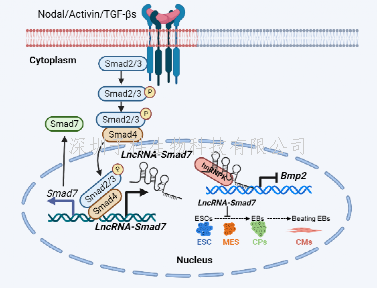 圖:Nodal信號通路轉(zhuǎn)錄激活長鏈非編碼RNA lncRNA-Smad7的表達(dá),lncRNA-Smad7結(jié)合在Bmp2的啟動子區(qū),抑制Bmp2的轉(zhuǎn)錄表達(dá),進(jìn)而調(diào)控小鼠胚胎干細(xì)胞向心肌細(xì)胞的分化過程。