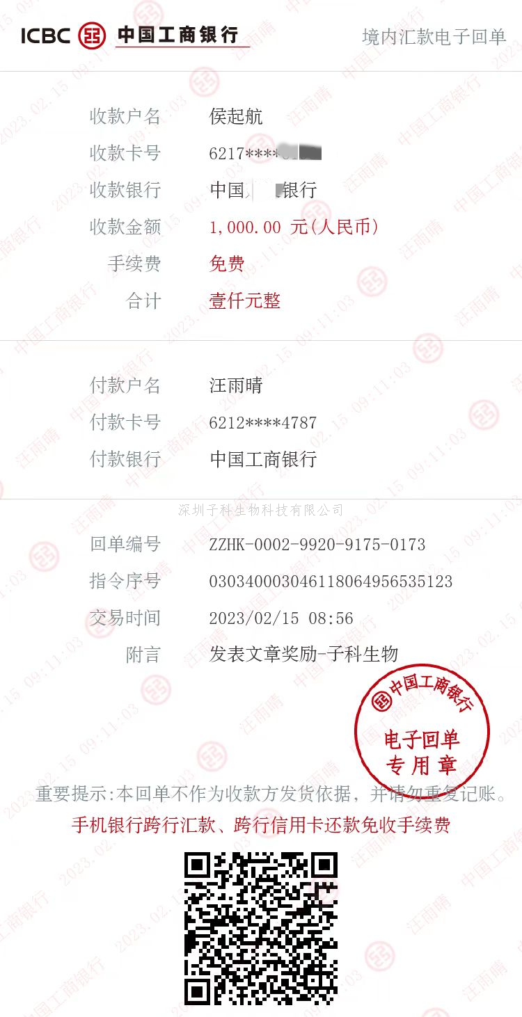 中國農(nóng)業(yè)大學(xué)侯老師為第一作者,因?yàn)榘l(fā)布的高分文章,所以獲得最高1000元獎(jiǎng)勵(lì),獎(jiǎng)金已經(jīng)如期發(fā)放哦!
