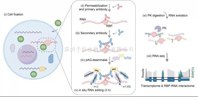 針對(duì)上述挑戰(zhàn),汪陽明團(tuán)隊(duì)創(chuàng)新性地設(shè)計(jì)并開發(fā)了MAPIT-seq技術(shù)。該方法通過“抗體定位+RNA編輯”的策略,將體外純化的protein A/G與兩種RNA編輯酶ADAR和APOBEC1的融合蛋白通過特異性抗體招募至目標(biāo)RBP結(jié)合的RNA區(qū)域,原位編輯三小時(shí)在RBP結(jié)合位點(diǎn)附近產(chǎn)生高效且特異的堿基編輯信號(hào),繼而通過高通量測(cè)序精準(zhǔn)識(shí)別RBP-RNA互作事件(圖1)。該方法不依賴基因工程操作,適用于固定細(xì)胞和冷凍組織,具有通用性強(qiáng)、分辨率高、操作簡便等特點(diǎn)。更重要的是,MAPIT-seq在檢測(cè)互作圖譜的同時(shí)可以同步獲取轉(zhuǎn)錄組信息,實(shí)現(xiàn)功能結(jié)合與表達(dá)背景的雙重解析。