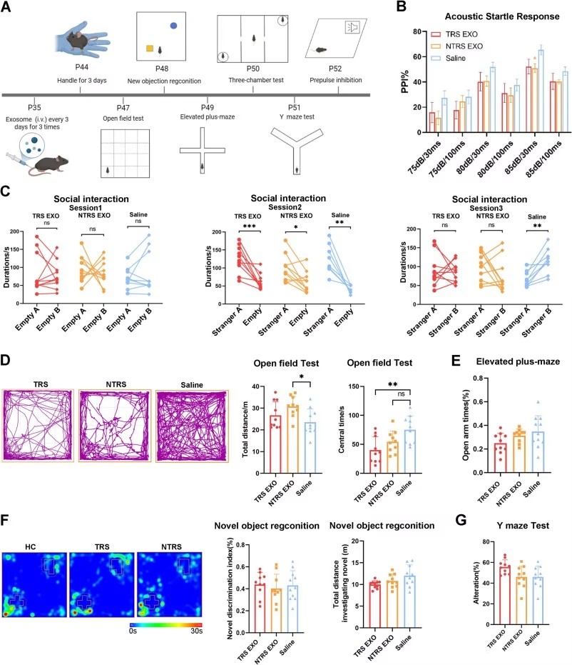 研究納入29名難治性精神分裂癥患者、29名非難治性精神分裂癥患者及31名健康對照者,均為漢族右利手,年齡18-50歲。通過分析血漿來源外泌體發(fā)現(xiàn),難治性與非難治性患者的外泌體均可使正常小鼠出現(xiàn)精神分裂癥核心行為缺陷,如85dB/30ms前脈沖刺激下的前脈沖抑制受損,以及三箱社交測試中社交認(rèn)知功能紊亂;其中難治性患者外泌體還會導(dǎo)致小鼠在曠場實驗中中央?yún)^(qū)停留時間顯著減少,提示更強(qiáng)的焦慮樣行為傾向。與之相反,健康對照者的外泌體可有效改善MK-801誘導(dǎo)精神分裂癥模型小鼠的癥狀,不僅能恢復(fù)前脈沖抑制功能,還能逆轉(zhuǎn)社交障礙與認(rèn)知缺陷,效果與抗精神病藥物奧氮平相當(dāng)。