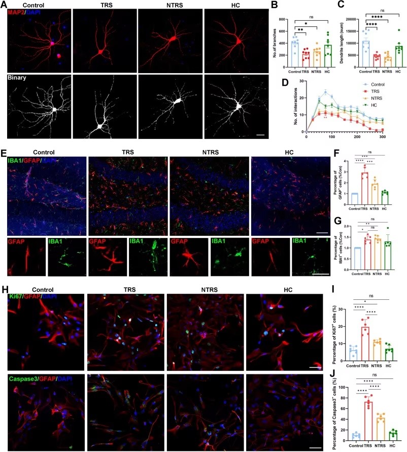 在細(xì)胞層面,難治性與非難治性患者的外泌體均會破壞海馬神經(jīng)元樹突結(jié)構(gòu),減少樹突分支數(shù)量與總長度,降低Sholl分析中的樹突交叉數(shù);同時還會誘導(dǎo)小鼠海馬齒狀回星形膠質(zhì)細(xì)胞與小膠質(zhì)細(xì)胞活化,表現(xiàn)為GFAP+與Iba1+細(xì)胞密度升高,且難治性患者外泌體引發(fā)的星形膠質(zhì)細(xì)胞反應(yīng)更強(qiáng)烈。體外實驗進(jìn)一步證實,這類外泌體會顯著促進(jìn)原代星形膠質(zhì)細(xì)胞增殖與凋亡,其中難治性患者外泌體的作用更突出。