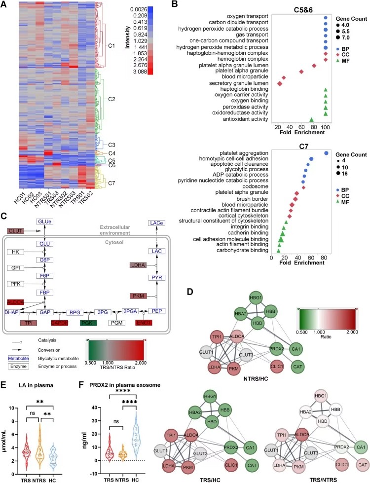 蛋白質(zhì)組學(xué)分析揭示了關(guān)鍵分子機(jī)制:難治性患者外泌體中存在缺氧、無氧糖酵解與氧化應(yīng)激相關(guān)的獨特蛋白特征——氧轉(zhuǎn)運蛋白(HBG1、HBB等)與抗氧化蛋白(PRDX2、CAT等)表達(dá)顯著降低,而無氧糖酵解關(guān)鍵酶(ALDOA、LDHA、PKM等)表達(dá)升高。這一變化導(dǎo)致患者血漿乳酸水平升高、PRDX2含量降低,且乳酸水平與認(rèn)知功能(如工作記憶、視覺學(xué)習(xí))呈負(fù)相關(guān),PRDX2水平與陰性癥狀嚴(yán)重程度呈負(fù)相關(guān),提示這些分子變化與疾病臨床表型密切相關(guān)。在動物與細(xì)胞模型中,外泌體處理也會引發(fā)類似的糖酵解酶上調(diào)與乳酸積累,其中難治性患者外泌體誘導(dǎo)的代謝紊亂更顯著。
