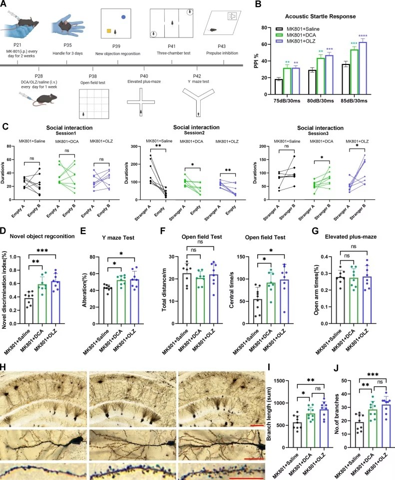 基于上述發(fā)現(xiàn),研究團(tuán)隊進(jìn)一步驗證了代謝調(diào)節(jié)的治療潛力。對MK-801模型小鼠使用乳酸生成抑制劑二氯乙酸(DCA)治療7天后,小鼠的精神分裂癥樣行為得到顯著改善:前脈沖抑制功能恢復(fù)正常,社交新穎性偏好與新物體識別記憶提升,工作記憶也有所改善;同時,海馬神經(jīng)元的樹突棘密度與總樹突長度被逆轉(zhuǎn)至接近正常水平,其療效與奧氮平相當(dāng),且未引發(fā)明顯運動副作用。