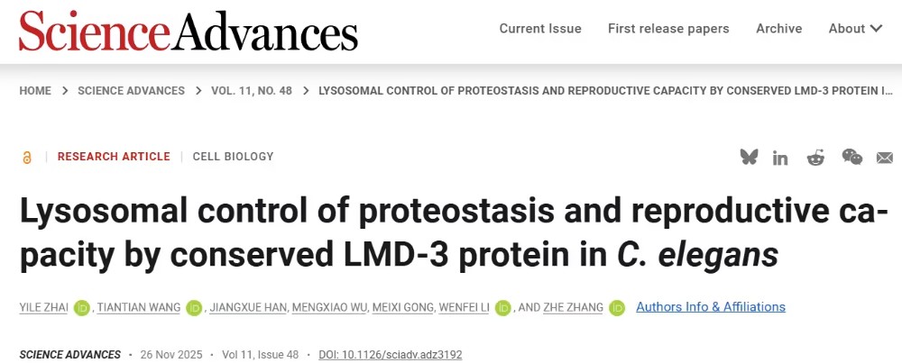 2025年11月26日,山東大學(xué)李文斐和張哲共同通訊在Science Advances(IF=11.7)在線發(fā)表題為Lysosomal control of proteostasis and reproductive capacity by conserved LMD-3 protein in C. elegans的研究論文。該研究鑒定出LysM結(jié)構(gòu)域蛋白LMD-3是調(diào)控秀麗隱桿線蟲蛋白質(zhì)穩(wěn)態(tài)與生殖能力的關(guān)鍵因子。