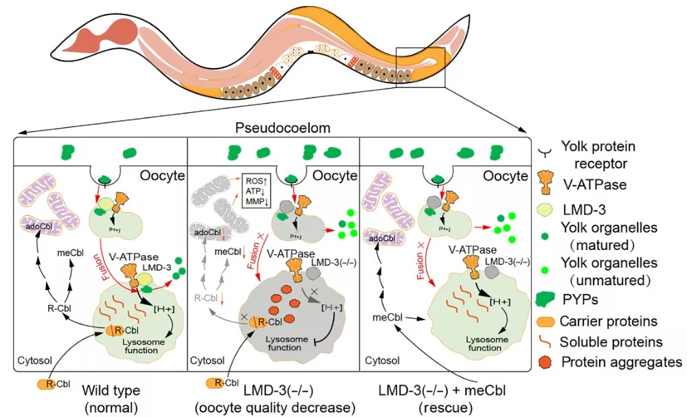 lmd-3缺陷會導(dǎo)致明顯的抗氧化能力缺陷和持續(xù)升高的細(xì)胞應(yīng)激反應(yīng)。作者發(fā)現(xiàn),定位于溶酶體的LMD-3通過其TLDc結(jié)構(gòu)域與卵黃蛋白原及質(zhì)子泵V型ATP酶相互作用,從而調(diào)節(jié)溶酶體功能并維持卵黃蛋白穩(wěn)態(tài)。此外,補充維生素B12可通過減輕氧化應(yīng)激和改善溶酶體功能,恢復(fù)lmd-3突變體的生育能力。這些發(fā)現(xiàn)為研究生殖健康及探索潛在治療策略建立了重要模型。