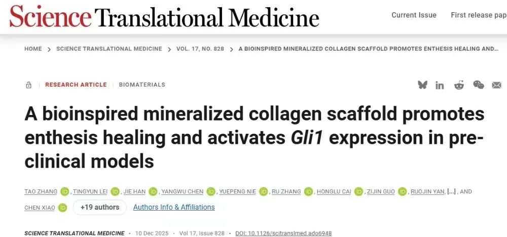 2025年12月10日,浙江大學(xué)陳曉、唐???、茵梓和沈煒亮共同通訊在Science Translational Medicine 在線發(fā)表題為A bioinspired mineralized collagen scaffold promotes enthesis healing and activates Gli1 expression in preclinical models的研究論文。該研究以2至3納米的分辨率發(fā)現(xiàn),礦物顆粒在纖維軟骨層中形成連續(xù)跨纖維相,并呈不連續(xù)分布。基于這一發(fā)現(xiàn),作者開發(fā)了一系列仿生礦化膠原基質(zhì),其特點為晶體同時分布于纖維內(nèi)與纖維外,且無機物含量質(zhì)量百分比可調(diào),可作為肌腱附著點修復(fù)的支架材料。