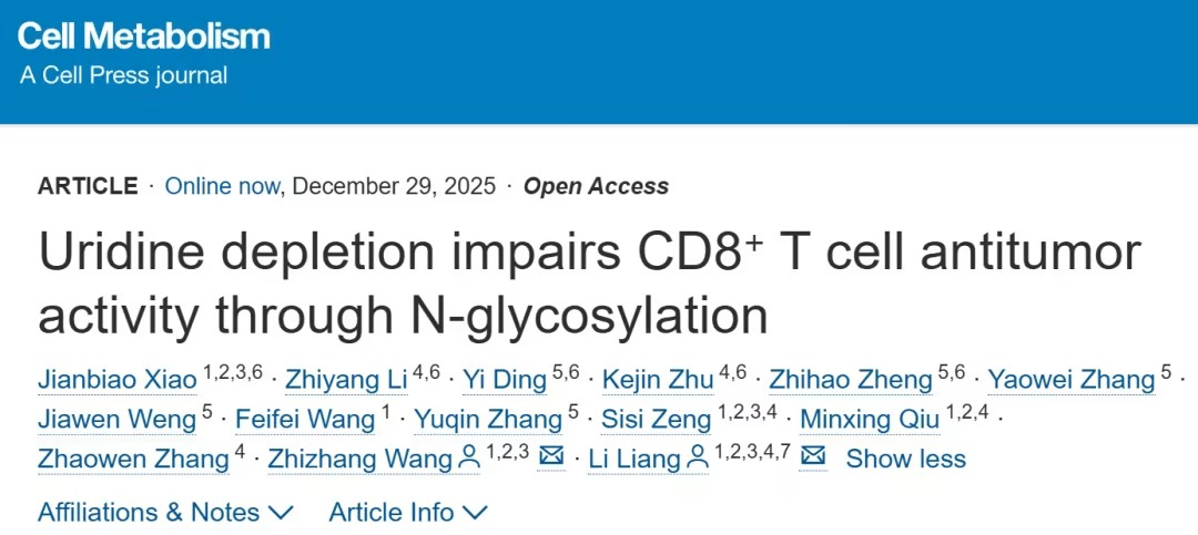 2025年12月29日,南方醫(yī)科大學(xué)梁莉、王志章共同通訊在Cell Metabolism(IF=30.9)在線發(fā)表題為Uridine depletion impairs CD8? T cell antitumor activity through N-glycosylation 的研究論文。該研究表明尿苷耗竭通過N-糖基化削弱CD8? T細(xì)胞抗腫瘤活性。