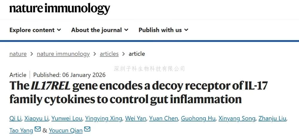 2026年1月6日,中國科學院上海營養(yǎng)與健康研究所錢友存和楊濤共同通訊在Nature Immunology 在線發(fā)表題為The IL17REL gene encodes a decoy receptor of IL-17 family cytokines to control gut inflammation的研究論文。