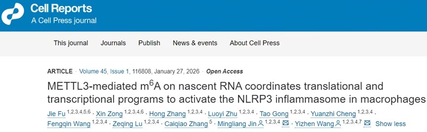 2026年1月11日,浙江大學(xué)汪以真、靳明亮共同通訊在Cell Reports 在線發(fā)表題為METTL3-mediated m6A on nascent RNA coordinates translational and transcriptional programs to activate the NLRP3 inflammasome in macrophages的研究論文。