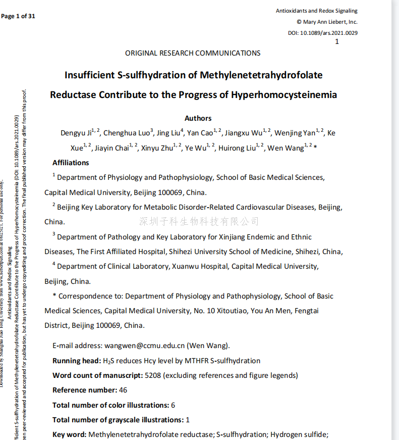 文章標(biāo)題:Insufficient S-sulfhydration of Methylenetetrahydrofolate Reductase Contribute to the Progress of Hyperhomocysteinemia.